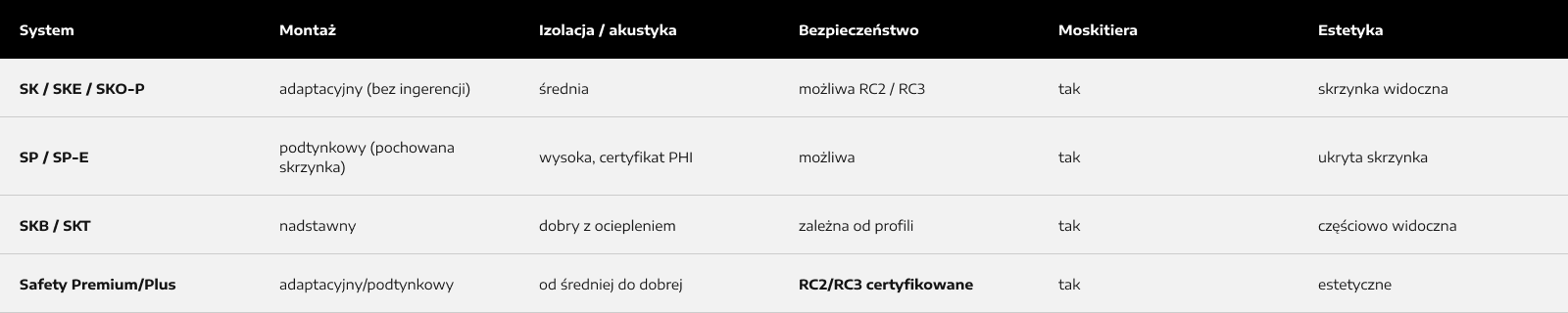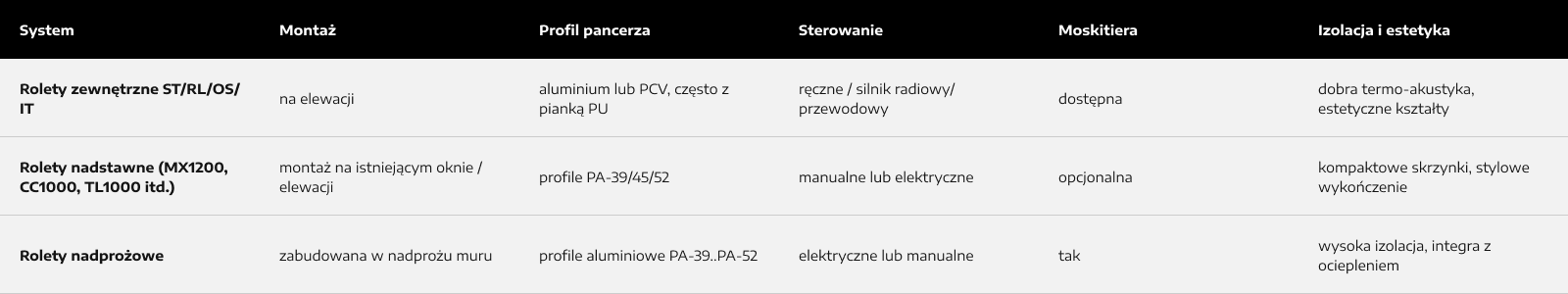 System MX1200: skrzynki dostępne w dwóch rozmiarach, kształty przystosowane do różnych typów profili okiennych, możliwość montażu z moskitierą, dobry dostęp serwisowy i stabilność konstrukcji dzięki stalowym wzmocnieniom.